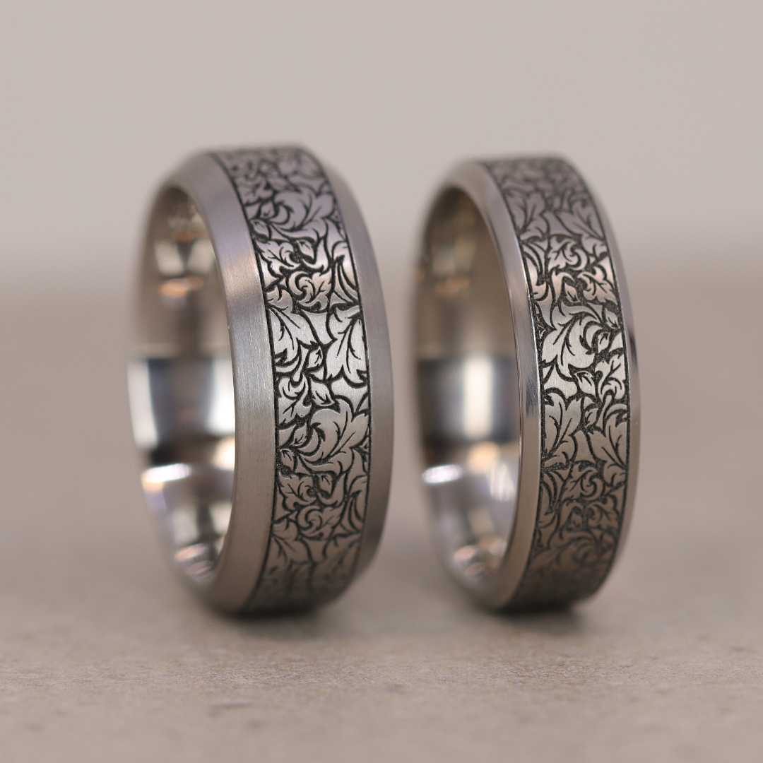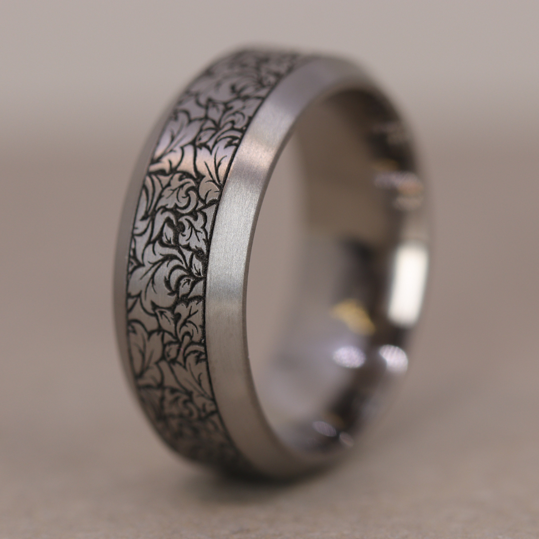 Titanium Floral Pattern Bevelled Edge Men's/Unisex 8.0mm Wedding Ring - The Wentworth Gardens - Made-to-Order