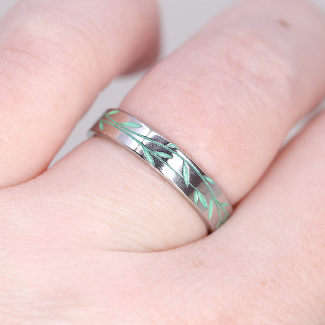 Lightweight and incredibly strong, it's no wonder Titanium is such a popular choice for first time ring wearers. With it's dark silver colour, Titanium is yet to find someone it doesn't look good on. Our Chelsea Park ring has a floral, vine like pattern laser engraved all the way around the band, a polished finish, is hypoallergenic and available in a 4mm width. Read more about Titanium here.
